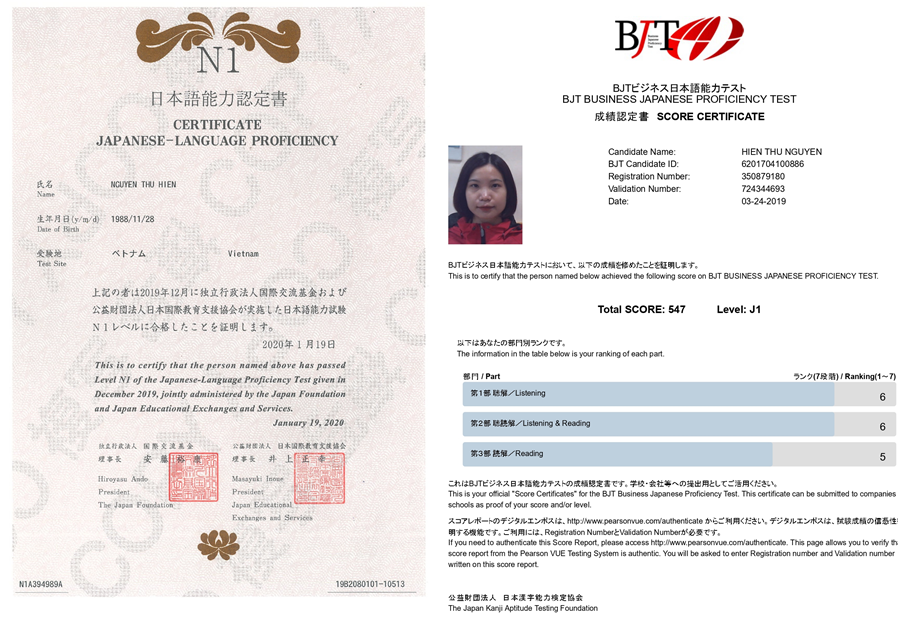 2019 (31 tuổi): Đạt chứng chỉ N1 (lần 5) tại Kỳ thi năng lực tiếng Nhật (JLPT)